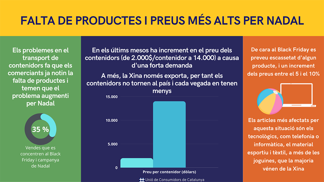 Segons el president de l’associació catalana de comerciants Retailcat, Joan Carles Calbet, en els últims mesos s’ha passat de pagar uns 2.000 dòlars per contenidor a uns 14.000, ja que hi ha un increment molt fort de la demanda, i donat que la Xina només exporta, els contenidors no tornen al país i cada vegada hi ha menys. “Els pocs que hi ha els estan fent pagar a preu d’or”, ha explicat.
